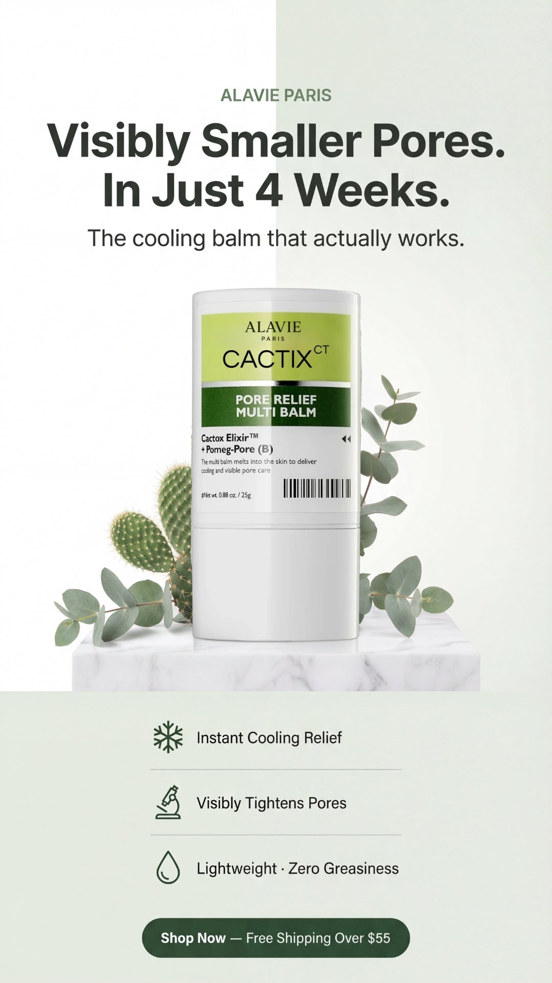 A cooling treatment balm thatvisibly minimizes enlarged pores, depuffs skin, and refines texture. The unique balm-to-gel formula provides instant relief whiletightening the appearance of poresover time.
